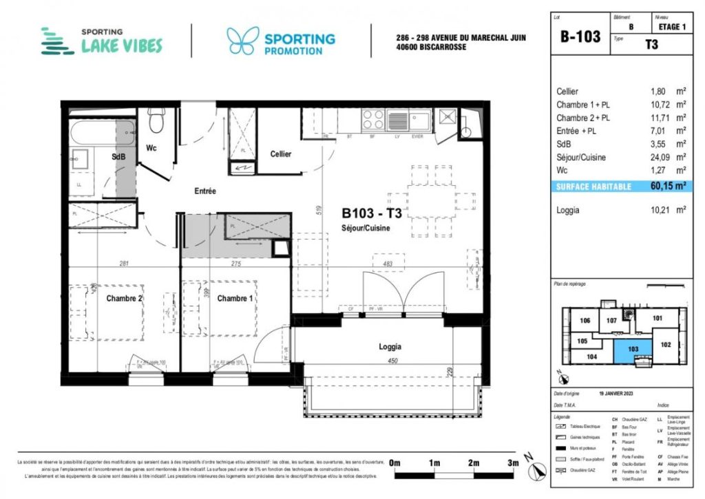 À louer à Biscarrosse, dans une résidence neuve et sécurisée, ce bel appartement T3 de 60,15 m², situé au 1er étage, vous séduira par son agencement fonctionnel et son environnement privilégié.