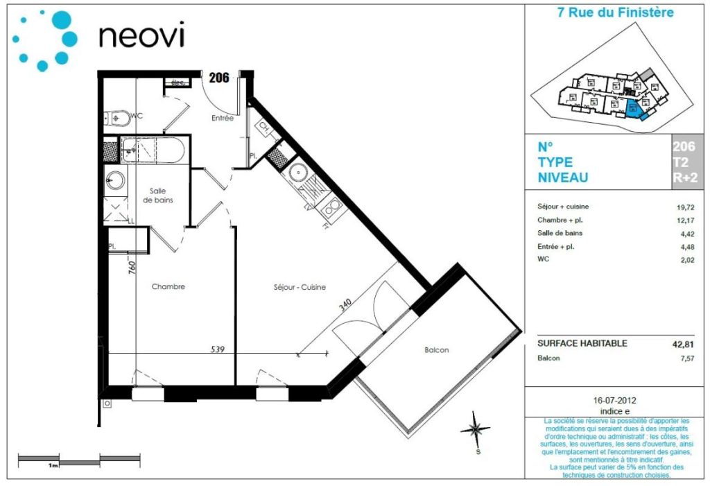 Il est composé d’une entrée avec placard, d’un séjour ouvrant sur un balcon de plus de 7 m² exposé sud ouest, d’une cuisine ouverte équipée (d’une plaque de cuisson vitrocéramique, d’une hotte aspirante, de meubles rangements), d’une chambre avec placard et salle de bain attenante, un WC séparé.