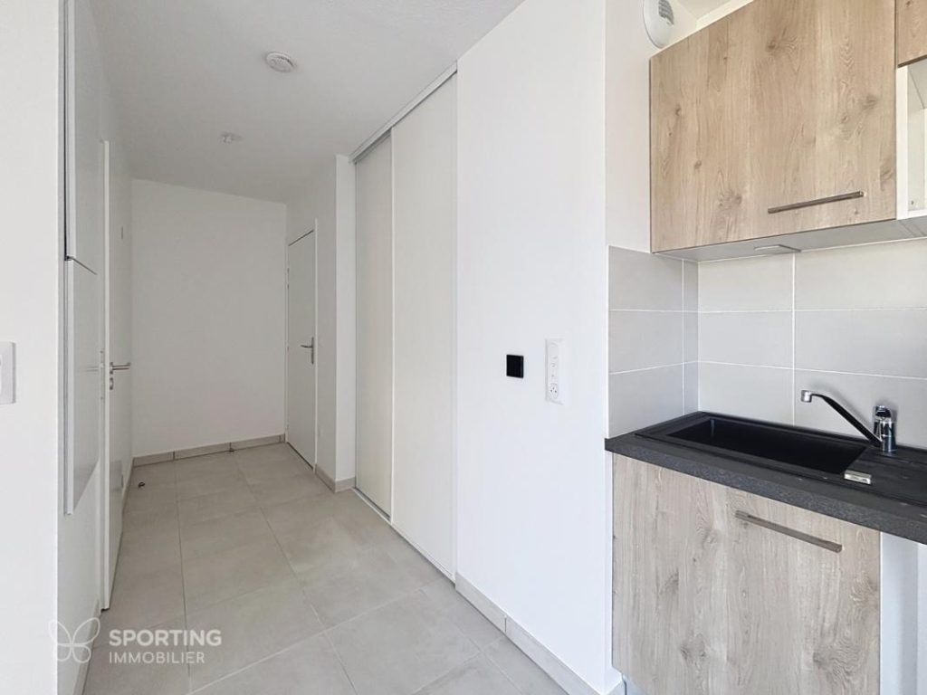Ce bien dispose d’une entrée avec placard aménagé, d’un séjour lumineux avec cuisine équipée (plaque vitrocéramique, hotte, meubles de rangement) donnant sur un balcon de 9 m², d’une chambre avec placard de 12 m² et d’une salle de bain avec WC.